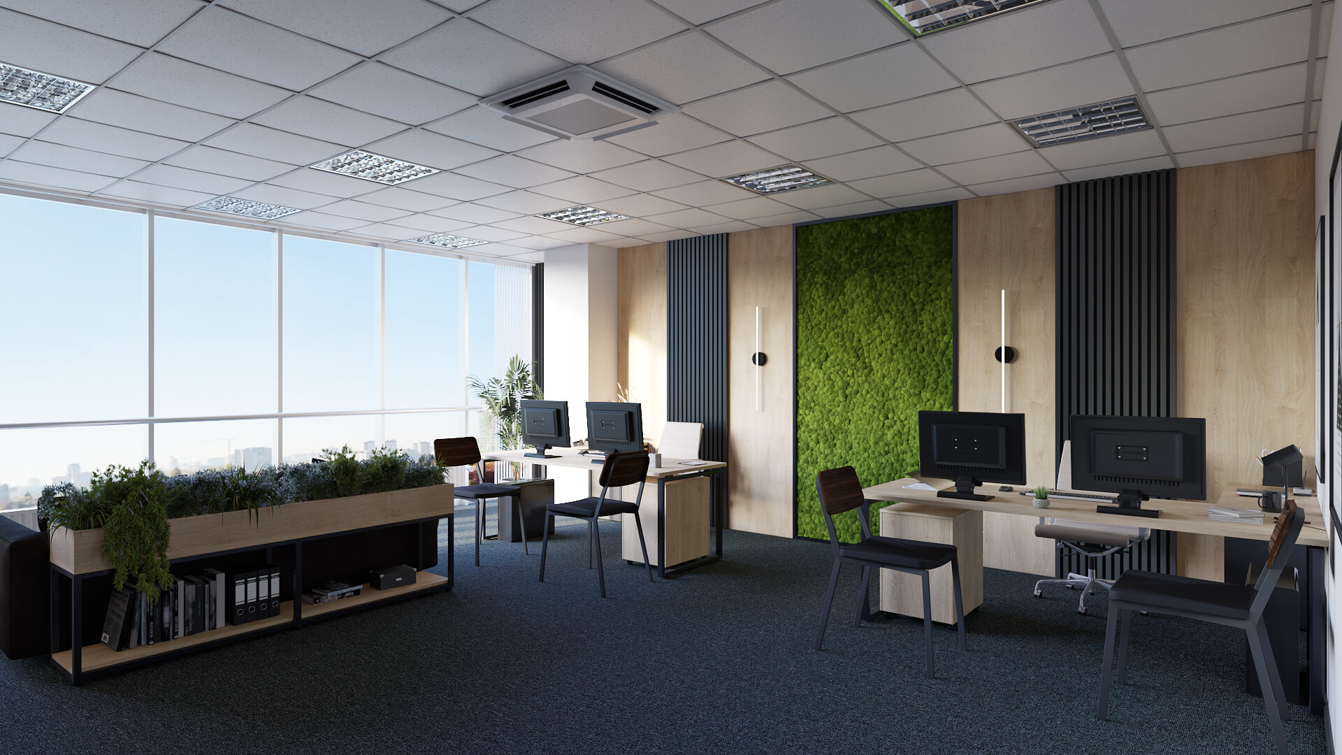 К примеру, стиль эко подразумевает использование натуральных материалов, таких как дерево, камни, глина. В этом случае будет уместным наличие живых цветов в горшках, аквариума и картин с изображением живой природы. Такой декор для офиса обычно оформлен в зеленых, серых, голубых и белых тонах.
