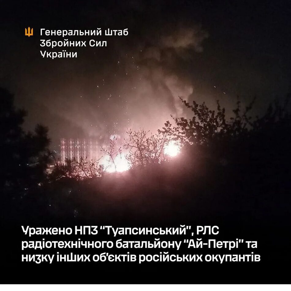 Генеральний штаб ЗСУ підтвердив ураження НПЗ “Туапсинський”, РЛС радіотехнічного батальйону “Ай-Петрі” та низки інших об’єктів російських окупантів, пише УНН.