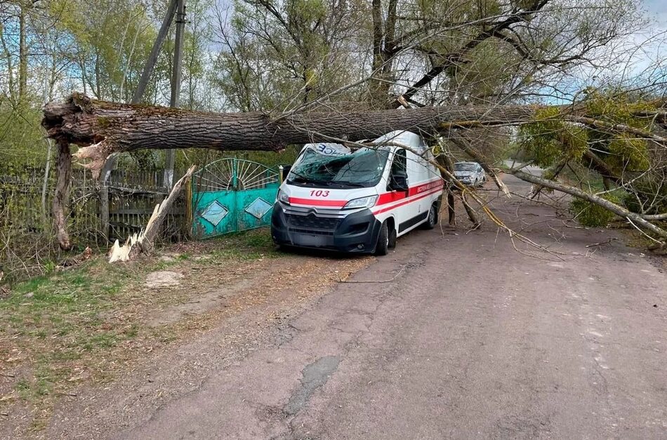 У Житомирській області через сильний вітер дерево впало на автомобіль швидкої допомоги, який прибув на виклик. Постраждалих немає.