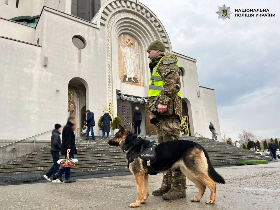 Під час Великодня посилено патрулювання з перевірками на вибухівку у понад 160 храмах Києва – поліція. Поліція посилила охорону церков у столиці під час Великодня із залученням кінологів. Створено додаткові групи для оперативного реагування на виклики.