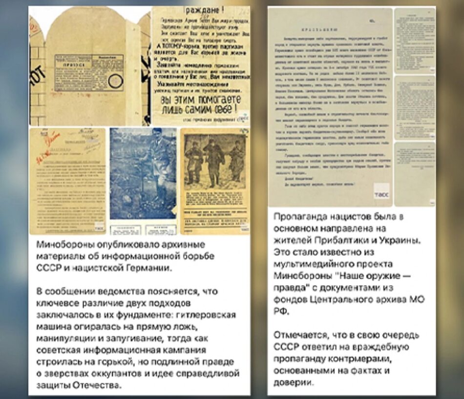 Зазначається, що російське військове відомство опублікувало матеріали про “інформаційне протистояння срср та нацистської Німеччини”. У коментарях до цих документів наголошується, що нацистська пропаганда була спрямована переважно на жителів України та Балтії.