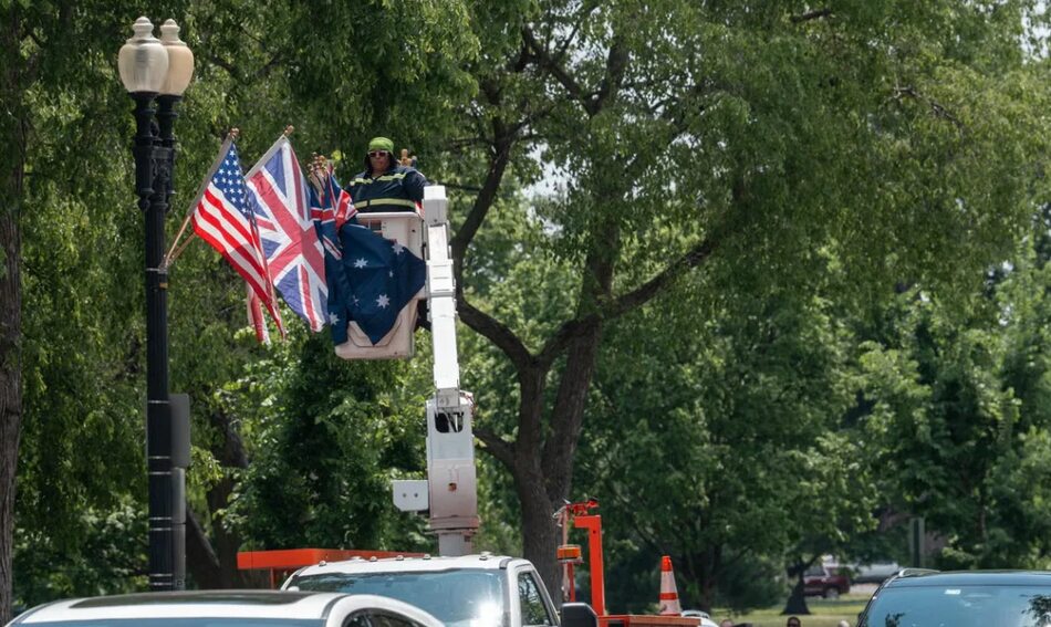 На фотографіях видно групи австралійських прапорів, що вишикувалися вздовж чорних ліхтарних стовпів поблизу Білого дому та адміністративної будівлі Ейзенхауера.