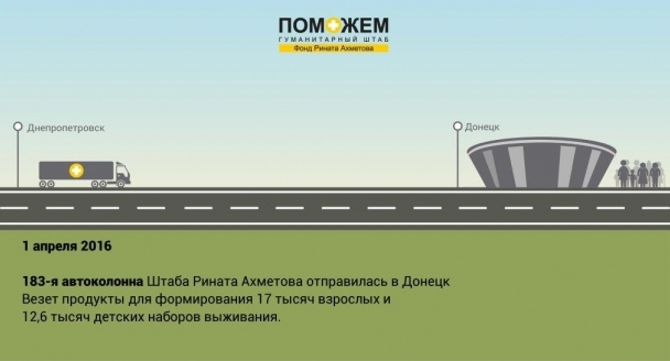 Сегодня утром, 1 апреля, из Днепропетровска в Донецк отправилась 183-я автоколонна Штаба Рината Ахметова. Это первая отправка помощи в апреле 2016 года.