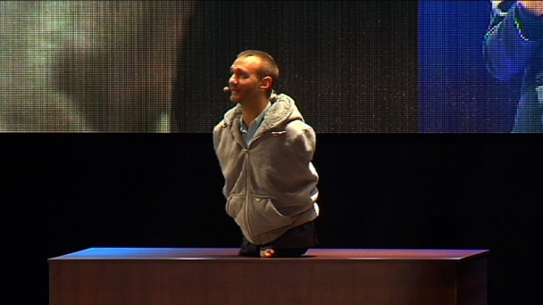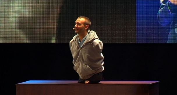 На сцену НСК «Олимпийского» Ник Вуйчич выехал в инвалидной коляске. Но своим воодушевлением и оптимизмом он мотивировал всех присутствующих в зале на дальнейшую жизнь даже в трудное для страны время.