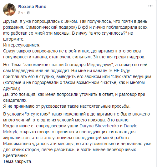 По словам Руно, причина увольнения заключается не в рейтингах, которые весьма высоки у программы. Ей не подходит спикер по теме освобождения украинцев из плена террористов, член трехсторонней контактной группы по Донбассу Виктор Медведчук.