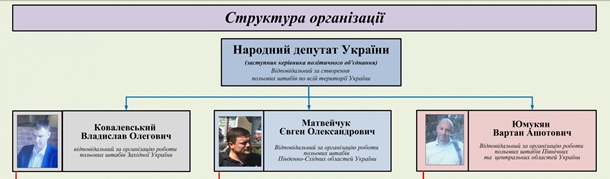 За организацию штабов в северных и центральных регионах отвечал Вартан Юмукян (глава партии Единая Украина, экс-советник главы Луганской областной администрации Валерия Голенко), в западных - Владислав Ковалевский и в восточных - Евгений Матвейчук.