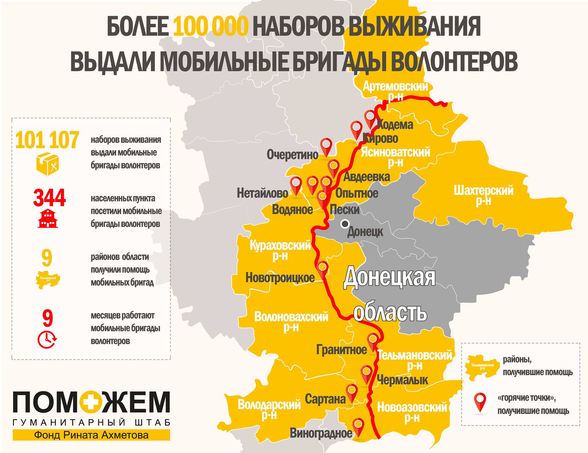 По состоянию на сегодня, 24 февраля, мобильные бригады Штаба Рината Ахметова выдали 101 107 продуктовых наборов в глубинке Донецкой области. Волонтеры посетили 344 населенных пункта.