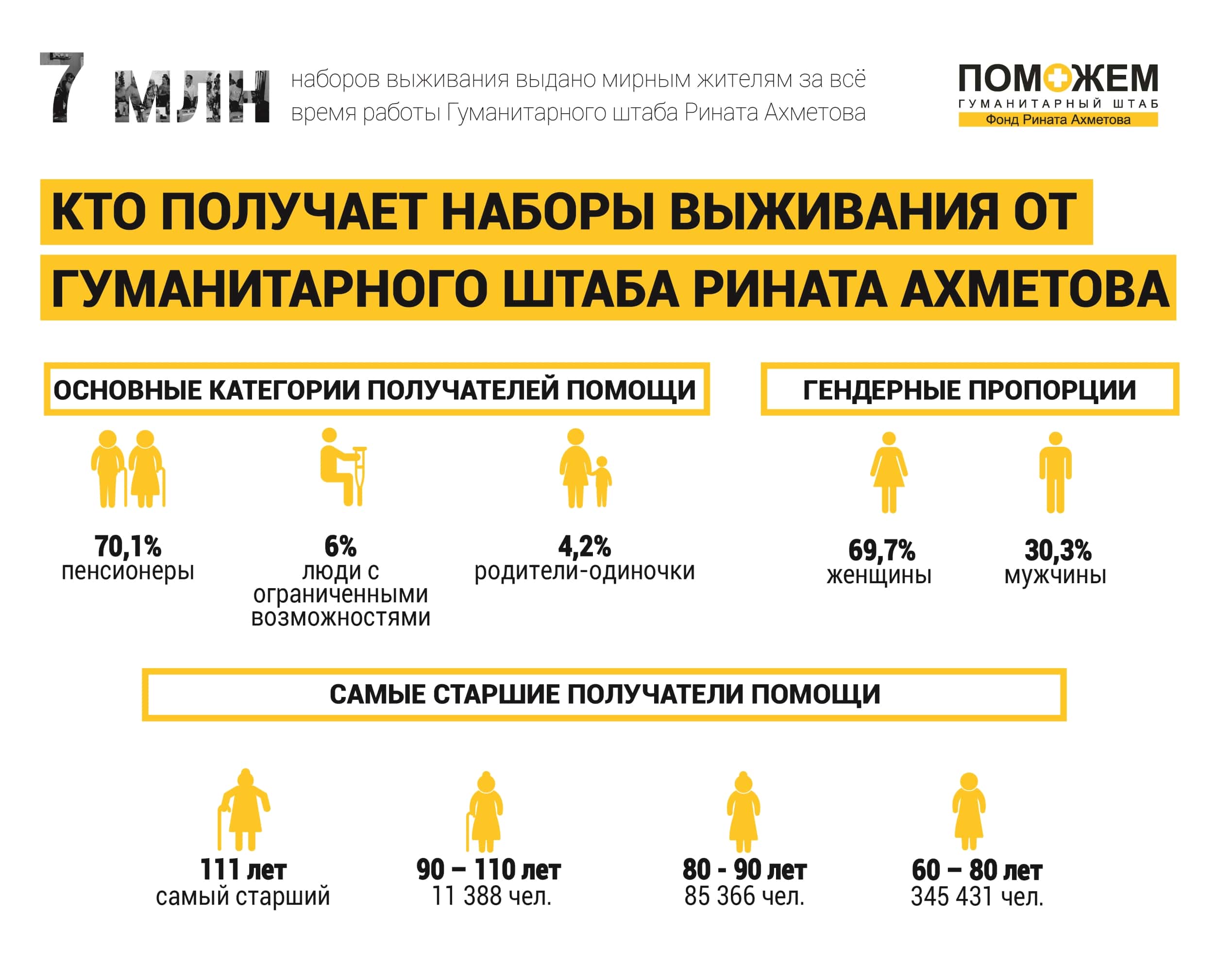 «На сегодняшний день мы выдали 7 миллионов наборов выживания мирным жителям Донбасса по обе стороны линии соприкосновения. С начала работы Штаба Рината Ахметова в августе 2014 года продуктовые наборы и другие виды помощи уже получили 1 млн 109 тыс. 089 человек. Помощь помогает выжить самым незащищенным, самым пострадавшим от войны землякам: пенсионерам, детям, инвалидам. Тем, кто остался на неподконтрольной территории, и переселенцам, покинувшим свои дома. 70% наших получателей – пенсионеры», – акцентировала Римма Филь.