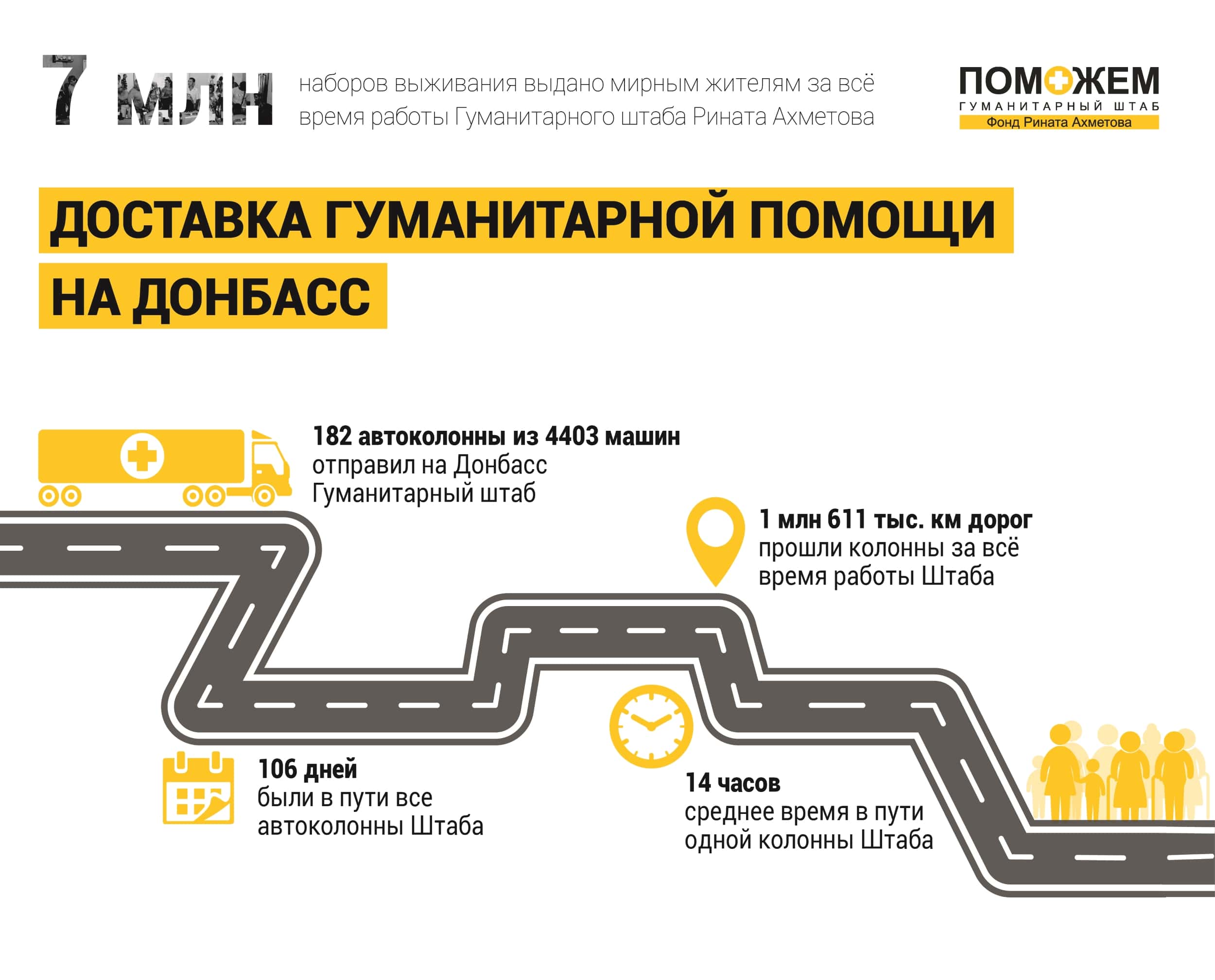 Для перевозки такого объема гуманитарного груза на Донбасс было отправлено 182 автоколонны из 4403 двадцати тонные фуры. Машины преодолели 1 млн 611 тыс. км дорог. Это 106 дней пути.