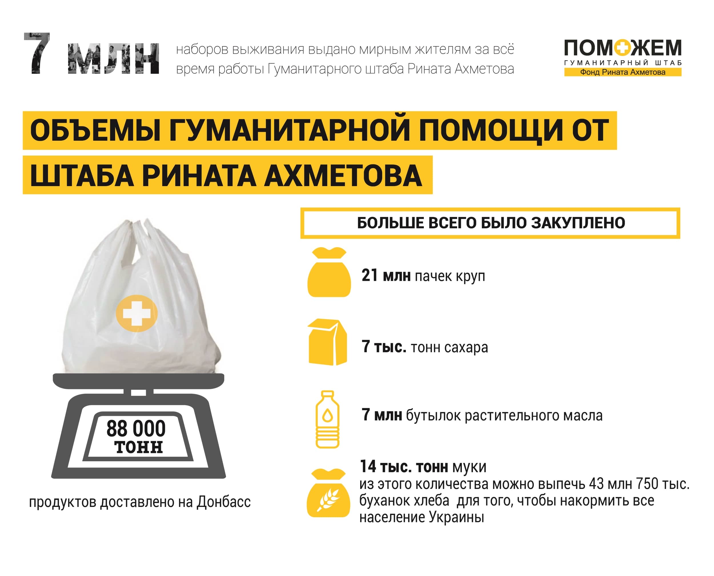 Чтобы сформировать и выдать 7 млн наборов выживания Гуманитарный штаб доставил в логистические центры в Донецке и Мариуполе 88 тыс. тонн продуктов. Штаб – один из крупнейших покупателей на продовольственном рынке Украины. Ежемесячно закупается 3,5 - 4,5 тыс. тонн продуктов.