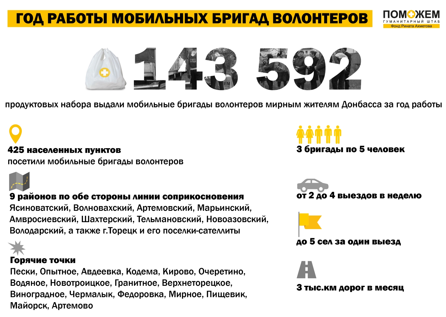 «У нас 3 мобильные бригады, которые работают по обе стороны линии соприкосновения. Это 15 человек, двое из них – женщины. Война не только ожесточила людей, но и многих сделала отзывчивее к боли и беде других. Эти люди стали волонтерами по зову сердца. Во время войны их всех объединило одно желание – помогать людям. Ради этой цели они готовы рисковать жизнью и продолжают свои выезды. Вся актуальная информация о ближайших выездах бригад обновляется на сайте Гуманитарного штаба», – рассказала Римма Филь.